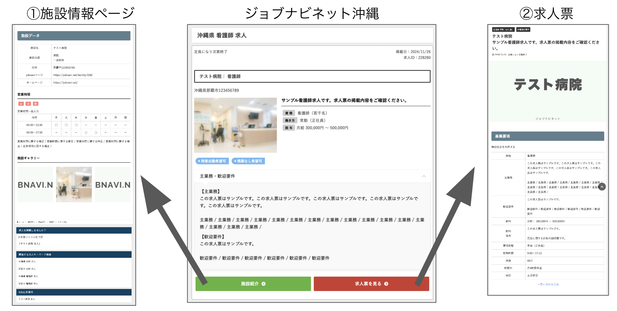 ジョブナビネットは、大きく「①施設情報ページ」と「②求人票」から構成されています。