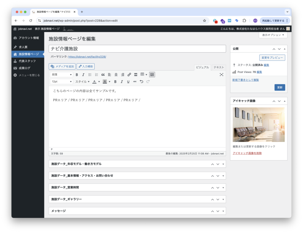 施設情報を編集したい。 2025/02/26 管理画面のメインナビゲーション(サイドメニュー)の「施設情報ページ」をクリックしてください。 「施設情報ページ」の一覧ページに移動します。 施設情報ページは、アカウント作成時点で自動作成されます。 追加したい場合は、申請が必要です。(有料) 登録申請については、カスタマーサポートからご連絡をお願いいたします。 編集画面 やりたいことについて → マニュアル 各入力項目の操作方法について → 各箇所のマニュアルポップ